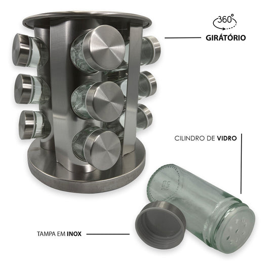 Porta Condimentos e Temperos Giratório com 12 Potes em Aço Inox e Vidro